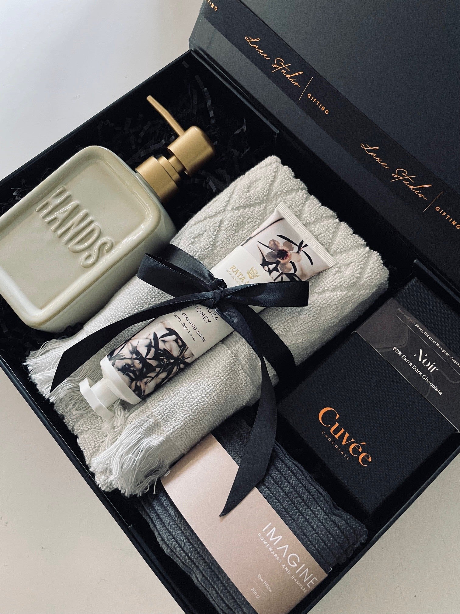 Beautifully presented in our signature black textured magnetic gift box with ribbon. Personalise your message at checkout or email info@luxestudiogifting.com.au for tailored gifting support.