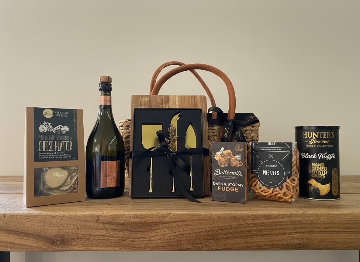 Elevate any celebration with The Grazing Elegance, a thoughtfully curated gourmet basket designed for those who appreciate quality, flavour and beautiful presentation. Perfect for housewarmings, settlement gifts, corporate gifting, thank-yous, or milestone celebrations, this premium hamper brings together indulgent savoury treats, artisan sweets and an elegant bottle of sparkling wine.