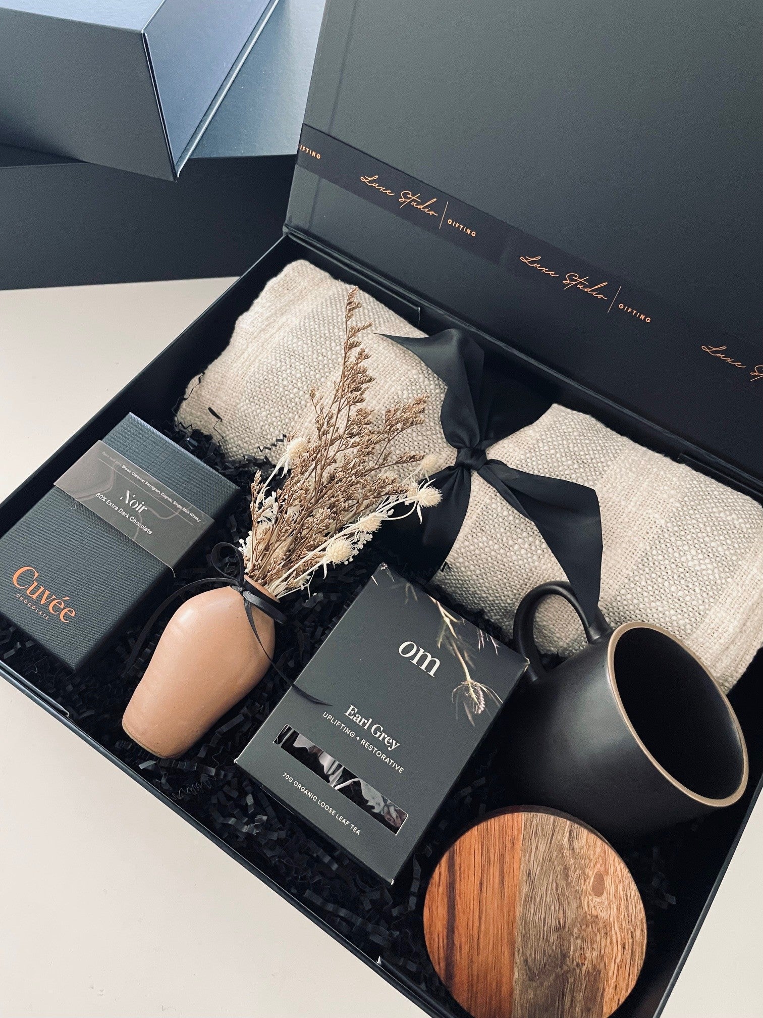 Beautifully presented in a sleek textured black magnetic close gift box with satin ribbon. Personalise your message at checkout or email info@luxestudiogifting.com.au
