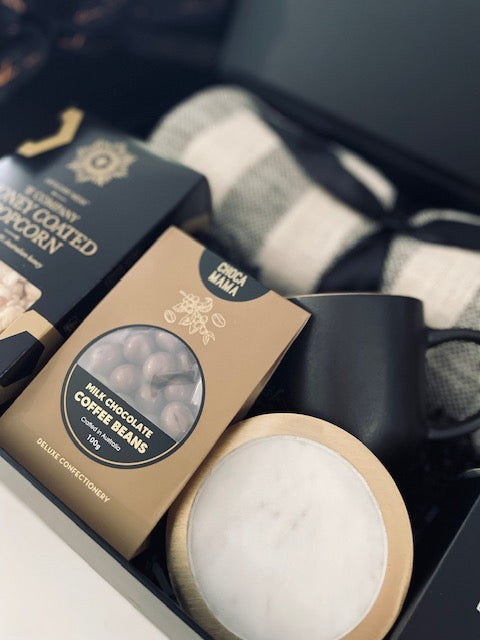 She’ll love cozying up with a cotton throw, enjoying the comforting aroma of a hand-poured candle, and sipping from an elegant mug while savouring honey-coated popcorn and milk chocolate coffee beans. Finished with a stylish marble coaster, this hamper is the definition of effortless indulgence.